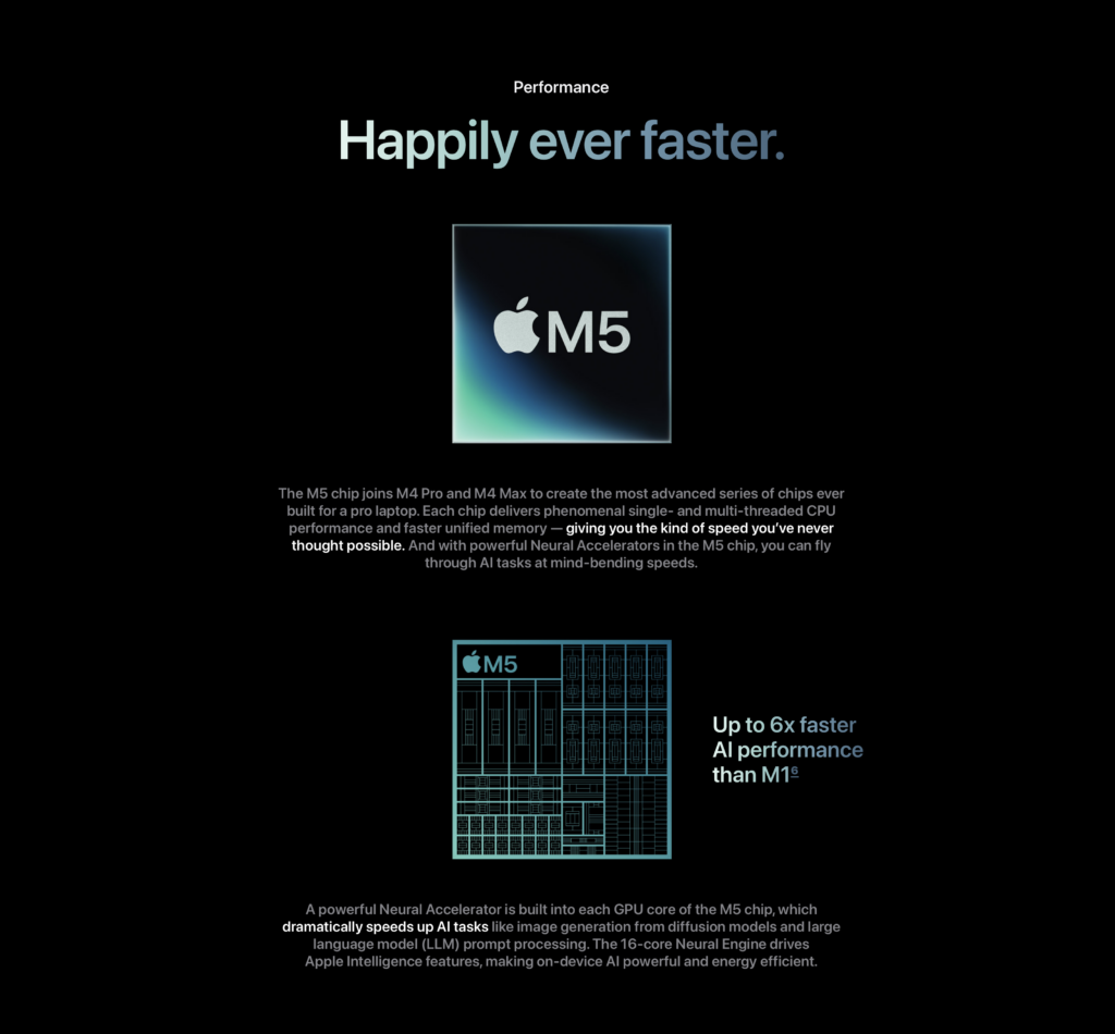 The M5 chip joins M4 Pro and M4 Max to create the most advanced series of chips ever built for a pro laptop. Each chip delivers phenomenal single- and multi-threaded CPU performance and faster unified memory — giving you the kind of speed you’ve never thought possible. And with powerful Neural Accelerators in the M5 chip, you can fly through AI tasks at mind-bending speeds.